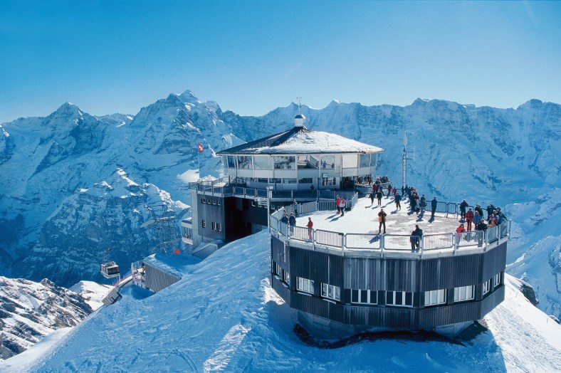 Le restaurant tournant du 007 Piz Gloria sur le Schilthorn (2,970 m) au-dessus de Muerren (1,638 m) dans l’Oberland bernois. A l’arriere-plan, le Moench, la Jungfrau et le Gletscherhorn.